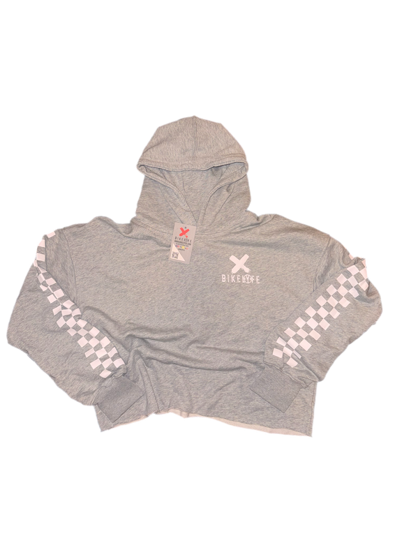 Ladies Elevate your streetwear game with this bold gray BIKELYFEX hooded sweatshirt featuring a striking white "X" on the back. The unique brush-stroke design and checkered patterns on the sleeves make this piece a standout addition to any fashion enthusiast's wardrobe. Perfect for casual wear or as a statement piece, this sweatshirt is sure to turn heads.